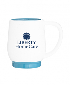 12 oz stoneware: matte white out / glossy color in with speckles and colored base. Hand wash recommended. Do not microwave with metallic imprint (glitz). Complies with FDA, Prop 65. 4.4375" H x 3.625" W