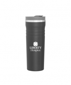 16.9 oz double wall tumbler with 18/8 stainless steel inner wall, stainless steel outer wall, vacuum insulation, push-on lid, swivel closure, stainless steel rim, and powder coated finish