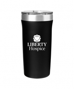 18 oz double wall 18/8 stainless steel thermal tumbler with vacuum insulation, brushed stainless steel rim, clear push-on acrylic lid with sliding closure, and powder coated finish. Hand wash recommended. Do not microwave. Complies with FDA, Prop 65. 7.25" H x 3.5" W