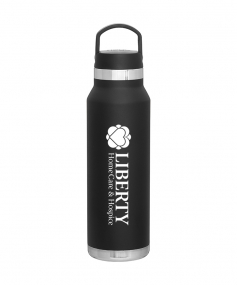 25 oz double wall 18/8 stainless steel thermal bottle with copper vacuum insulation, threaded insulated lid with carrying handle, high polish accent, stainless steel base, and powder coated finish. Hand wash recommended; Do not microwave. Dimensions: 10 H x 3".
