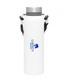 32 oz double wall 18/8 stainless steel thermal bottle with copper vacuum insulation, insulated stainless steel threaded lid, silicone ring, removable strap with buckles, removable clasps, and powder coated finish. Individual gift box. Hand wash recommended. Do not microwave. Complies with FDA, Prop 65. 11" H x 3.1875" W