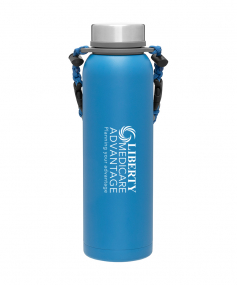 32 oz double wall 18/8 stainless steel thermal bottle with copper vacuum insulation, insulated stainless steel threaded lid, silicone ring, removable strap with buckles, removable clasps, and powder coated finish. Individual gift box. Hand wash recommended. Do not microwave. Complies with FDA, Prop 65. 11" H x 3.1875" W