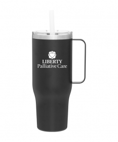 40 oz double wall 18/8 stainless steel thermal mug with copper vacuum insulation, stainless steel rim, dual-purpose push-on clear lid, matching sliding closure, flexible wide silicone straw, and powder coated finish. Individual gift box. Hand wash recommended. Do not microwave. Complies with FDA, Prop 65. 9.75" H x 4" W