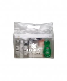 It's always the little things that are forgotten that are hard to find at your new place. We packed all the essentials into one handy tote. EST Shampoo, Conditioner, Body Wash, Lotion & Hand Soap, Old Spice and Dove Deodorants, Toothbrush, Colgate Toothpaste, Whispermint Mouthwash, Brush/Comb, Band Aids, Advil packet, Emergen-C Drink Packs, Alka Seltzer, Baby Wipes, Cotton Balls/Qtips, Tide Laundry Packet and Palmolive Dishwashing Soap. 9 1/2" W x 8" H x 2 3/4" D